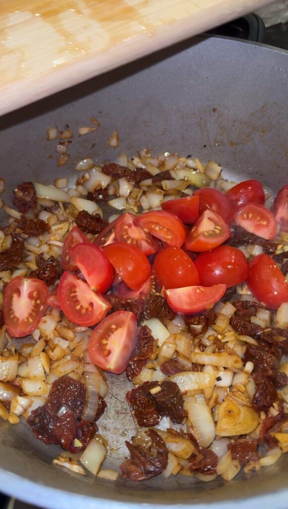 - In derselben Pfanne die fein gehackte Zwiebel und den Knoblauch im Bratfett glasig dünsten. Das Tomatenmark zugeben und kurz anrösten. Anschließend die halbierten Cocktailtomaten und die getrockneten Tomaten unterrühren.