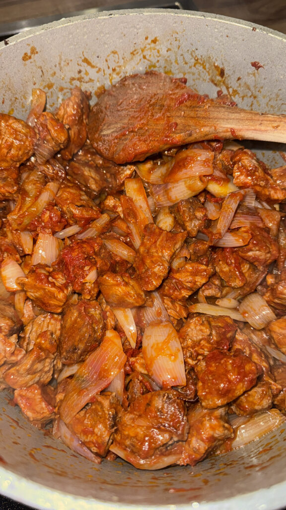 - Die halbierten Schalotten im Öl oder bei Bedarf erneutem Butterschmalz anbraten, bis sie Farbe bekommen. Das Tomatenmark zugeben und kurz mitrösten. Danach das angebratene Fleisch wieder hinzufügen.